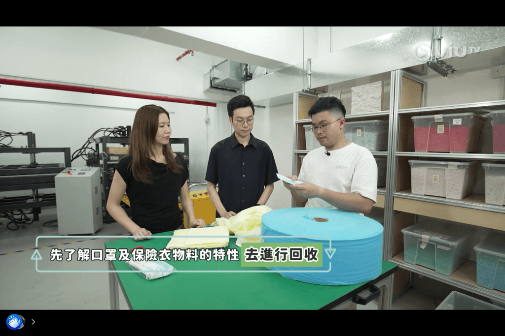 來自護老院的回收藍色醫用口罩與黃色防護衣,經過再造處理後成兼具實用與象徵意義的藝術裝置。